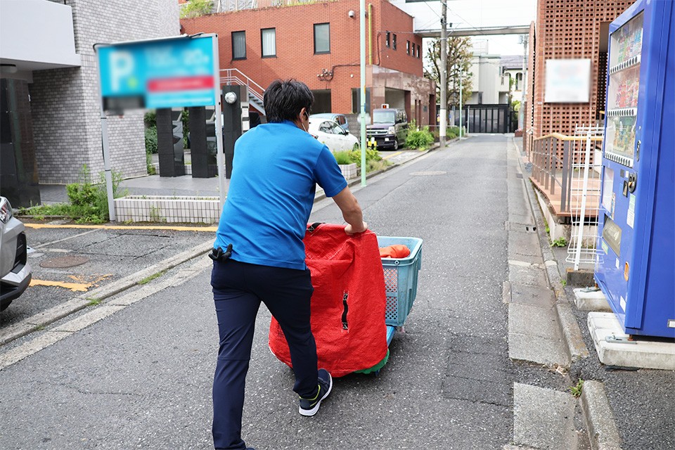 回収の荷物が重い時は、先輩が筋トレだ!がんばれ!