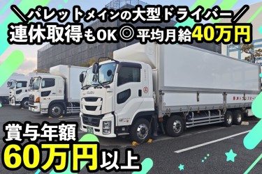 【大型トラックドライバー】乳業メーカーや大手チェーン店の荷物を扱います。関西から関東方面(東京・千葉・栃木・埼玉など)での食品配送です!8割以上がパレット輸送なので、身体の負担は少なめ!◎車種:大型トラック(ウィング車、箱車)◎荷物:乳製品などの食品◎荷役方法:8割以上がパレット輸送!コースにより一部バラ積みあり ◎配送エリア:関西エリア→関東エリア長距離配送なので、ベッド併設はもちろんのこと、冬場はポータブル電源や電気毛布も配布するため、エンジンを止めても快適に休めます!◆全線高速道路使用OK (ETC完備) ◆基本一人一台の車両貸与◆トラックは頻繁に入れ替え