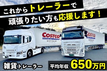 ①コンテナ専用トレーラーでコストコ商品の配送②ウィングトレーラーで一般雑貨の集荷・配送①事務所を出発して三木(兵庫)のセンターから滋賀県のコストコ店舗まで配送します。長距離の配送なしでガッツリ稼げる仕事なので、少しでも多く稼ぎたい方は是非ご覧ください!②ウィングトレーラーを使用して一般雑貨の集荷と配送を行います。神戸から出発して広島方面へ配送していただきます。①も②も担当していただきます。割合は①が7割、②が3割ほどです。誰かに負担が偏らないように、満遍ない配車を心がけています!なので当社のドライバーさんはみんな、平等に売り上げが上げれています!スケジュール例1:00 出勤 三木のセンターに向かう1:45 センターに到着して連結作業を行う2:00 連結作業完了 滋賀県のコストコ店舗に向けて出発4:30 現地到着 空車になっているトレーラーと繋ぎかえ作業開始5:00 繋ぎかえ作業および休息完了 三木のセンターに向けて出発7:30 三木のセンターに到着 切り離し作業を開始7:45 切り離し作業を完了して休息開始12:30 休息終了 三木のセンターにて連結作業開始13:00 連結作業完了 滋賀県のコストコ店舗に向けて出発15:30 到着して荷降ろし作業待ちおよび休息17:00 荷降ろしと休息を終えて三木のセンターに向けて出発19:30 三木のセンターに到着 切り離し作業を開始19:45 切り離し作業完了 車庫に向かう20:30 車庫に帰庫して業務終了