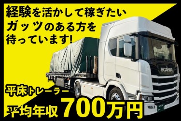 ■平床トレーラーによる集荷配送業務鋼材や建築資材、材木などからコイル、鉄板などの配送です。配送距離は、近距離から長距離までさまざまです。長距離の配送で東京まで集荷、配送するお仕事もあれば、九州までワンタッチで返ってくるお仕事もあります。様々な仕事があり、覚えるのが大変な分、圧倒的に稼げます!誰かに負担が偏らないように、満遍ない配車を心がけています。なので当社のドライバーさんはみんな、平等に売り上げが上げれています。スケジュール例1日目4:00 出勤 宵積みしていたフレコン貨物を配送8:30 香川県の直島に到着して荷降ろし9:30 荷降ろし完了、移動開始11:00 岡山県倉敷市の積み込み場に到着して鉄筋の積み込み12:30 積み込み完了して休憩開始13:30 休憩終了して富山県に向かう17:00 敦賀の高速パーキングで停車(業務終了)2日目4:00 出勤 富山県に向かう8:00 富山県の目的地に到着して荷降ろし9:30 荷降ろし完了10:30 同じに富山県内の積み込み場所に到着 鉄骨を積む11:30 積み込み完了 休憩開始12:30 休憩終了 大阪府の西淀川に向けて運行開始16:30 京都府内のPAで停車(業務終了)